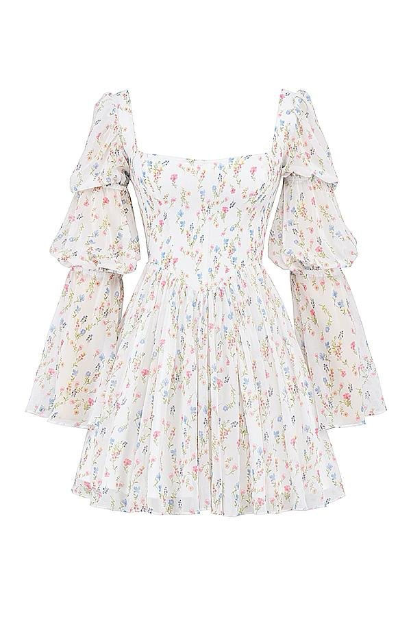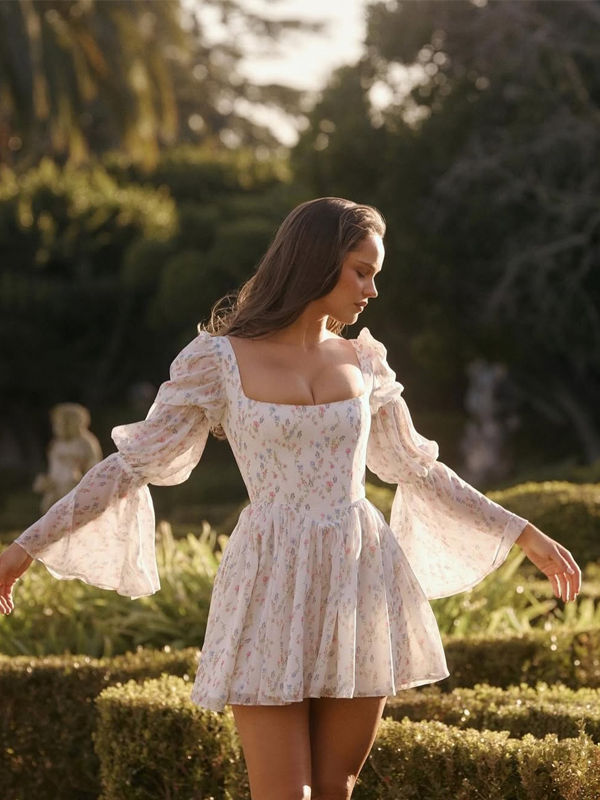 The floral print and feminine design of ‘LILY’ is as pretty as you’d expect from our Angel Collection. Beautifully cut from a floaty georgette, it has a square neckline and the bodice features our waist cinching corsetry. We love how the tiered puff sleeves compliment the voluminous mini skirt for the prettiest silhouette. It zips to the back for easy on.